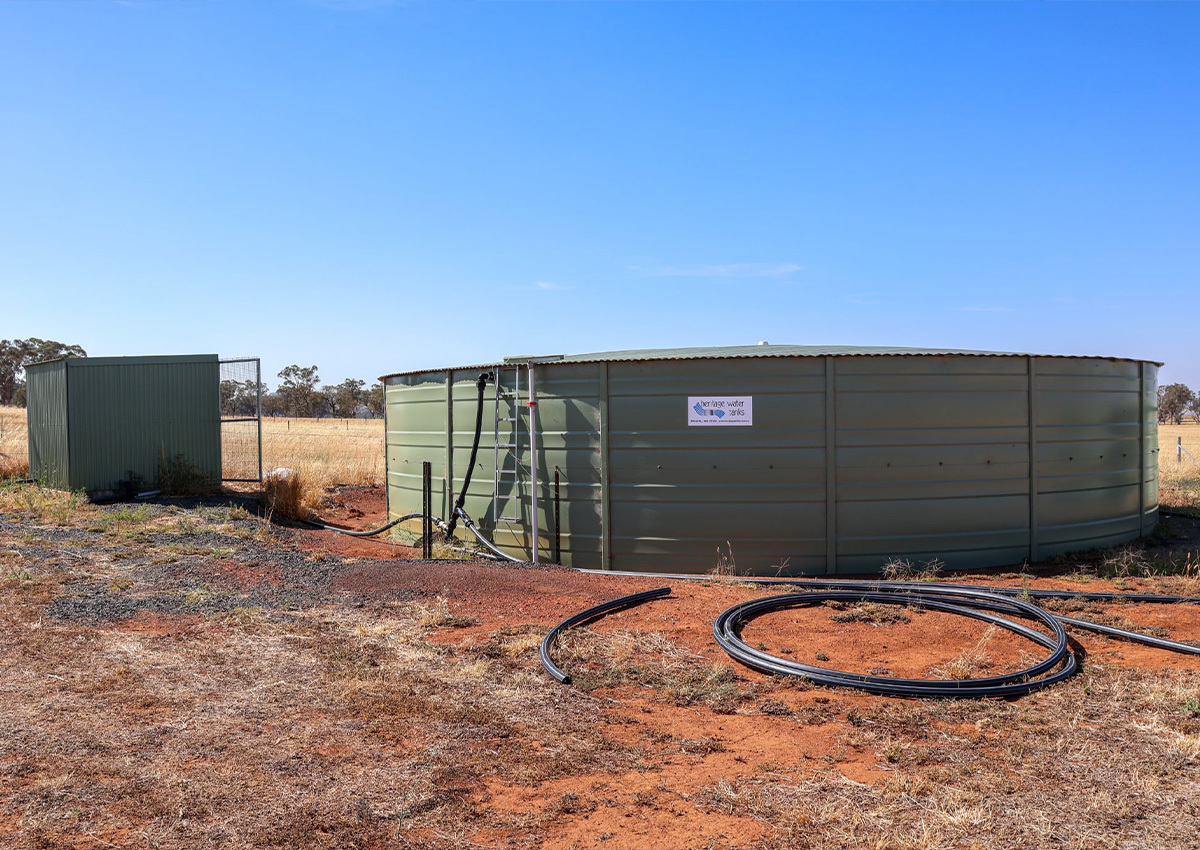 The site includes two elevated storage tanks at the top of the property, fed by town water and a bore, as well as two large storage tanks adjacent to the pump shed, from which the booster set draws.