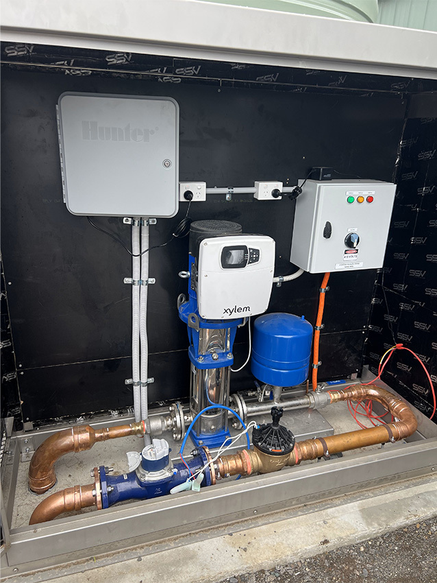 The existing system, connected directly to the school’s potable cold-water supply, lacked the required flow and pressure for efficient turf irrigation, causing poor coverage and a long watering time or ‘window’. It was wasting water and failing to meet the required performance of their sports field’s natural turf surface. A modern pump system was essential to improve efficiency and deliver consistent performance and sustainability.