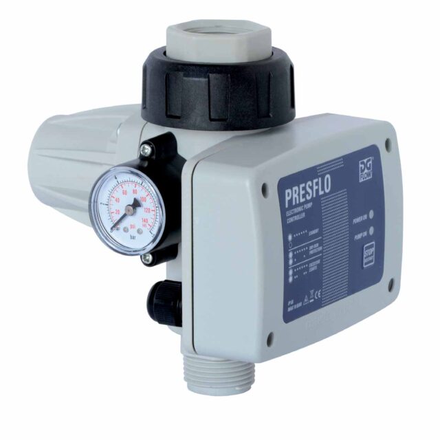 The PresFlo electronic pressure flow regulator starts/stops the pump based on demand. It is capable of satisfying the most varied of needs while guaranteeing the pump works reliably and safely. It substitutes a traditional pressure switch/surge tank system while offering reduced dimensions, no maintenance requirements, constant flow and pump protection.